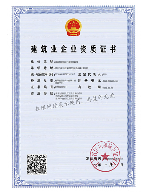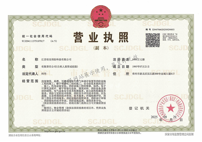 江蘇恒安消防科技有限公司,座落于常州市新北區漢江路368號金城大廈六樓,辦公面積1300平方米。注冊資金3000萬元,是一家專門從事消防工程設計、安裝、調試、維修保養的專業工程公司。公司成立于1995年,具有獨立的法人資格,具備江蘇省住房和城鄉建設廳頒發的建筑業企業消防設施工程專業承包壹級資質,電子與智能化工程專業承包貳級資質,建筑機電安裝工程專業承包貳級資質。 公司主要職能部門有:董事長室、總經理室、綜合辦、財務部、技術部、工程項目部、業務部、材料采購部等八個部門以及南京、泰州、淮安、徐州、宿遷、揚州、連云港等分公司。
